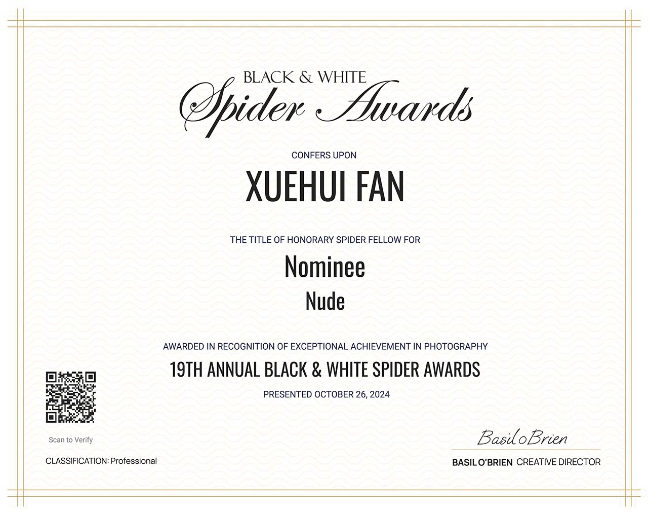 参加竞赛留念 这个世界级的摄影竞赛,全球参赛者众多、题材全面,是少见的高水平摄影竞赛。虽然沙龙味道很浓,小聪明、抖机灵 的作品也很多。但和国内不同的是,没有那种利用体制来拉大旗、用纸来换钱的明显腐败、用虚假荣誉愚弄民众等,也 没有各类乌合之众的民间摄影艺术团体的自嗨。相对公开度较高。 已经连续十几年接到摄影竞赛的参赛邀请。原本没有兴趣,但在去年想研究和学习一下它的商业艺术运作机制,就参加 了2024年黑白人体类的竞赛。提交了一幅作品,2019年在西北拍摄的河床上的美女那幅,做过年历,当年已提供会员。 作品被数位国际评委提名,这里展示一下证书,留个纪念。 大家有空可以去网站看一下:www.thespiderawards.com 祖先说:当你弄不明白的时候,学习可以解决问题。自大和傲慢的背后,是自卑和无知。本次参加竞赛的目的已经全部 基本达到。