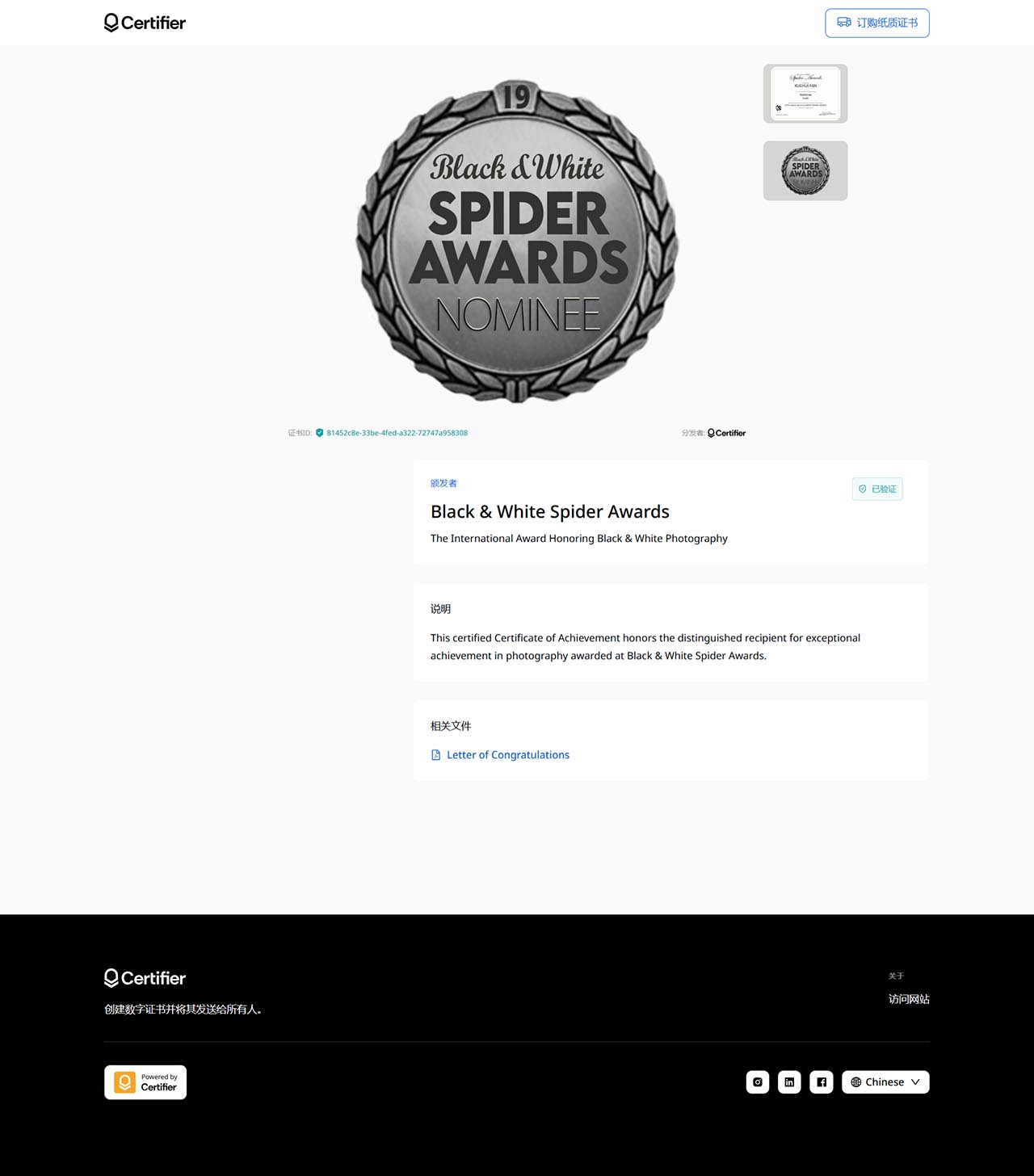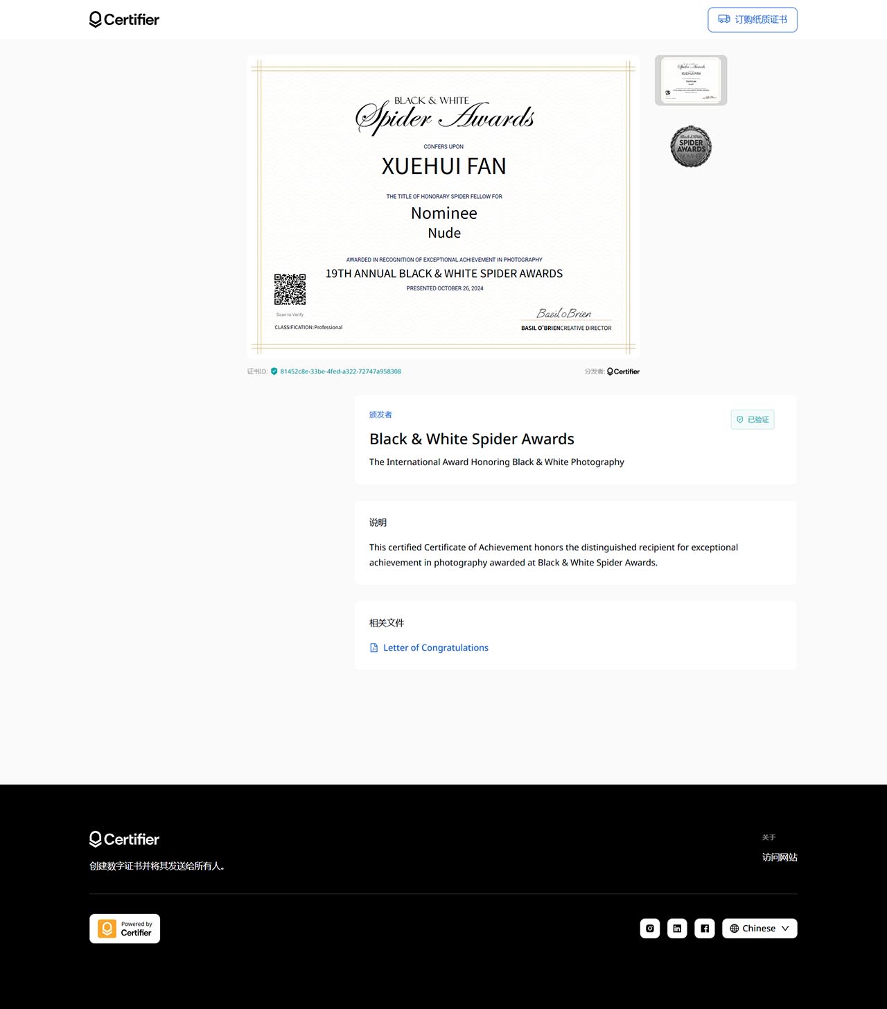 参加竞赛留念 这个世界级的摄影竞赛,全球参赛者众多、题材全面,是少见的高水平摄影竞赛。虽然沙龙味道很浓,小聪明、抖机灵 的作品也很多。但和国内不同的是,没有那种利用体制来拉大旗、用纸来换钱的明显腐败、用虚假荣誉愚弄民众等,也 没有各类乌合之众的民间摄影艺术团体的自嗨。相对公开度较高。 已经连续十几年接到摄影竞赛的参赛邀请。原本没有兴趣,但在去年想研究和学习一下它的商业艺术运作机制,就参加 了2024年黑白人体类的竞赛。提交了一幅作品,2019年在西北拍摄的河床上的美女那幅,做过年历,当年已提供会员。 作品被数位国际评委提名,这里展示一下证书,留个纪念。 大家有空可以去网站看一下:www.thespiderawards.com 祖先说:当你弄不明白的时候,学习可以解决问题。自大和傲慢的背后,是自卑和无知。本次参加竞赛的目的已经全部 基本达到。